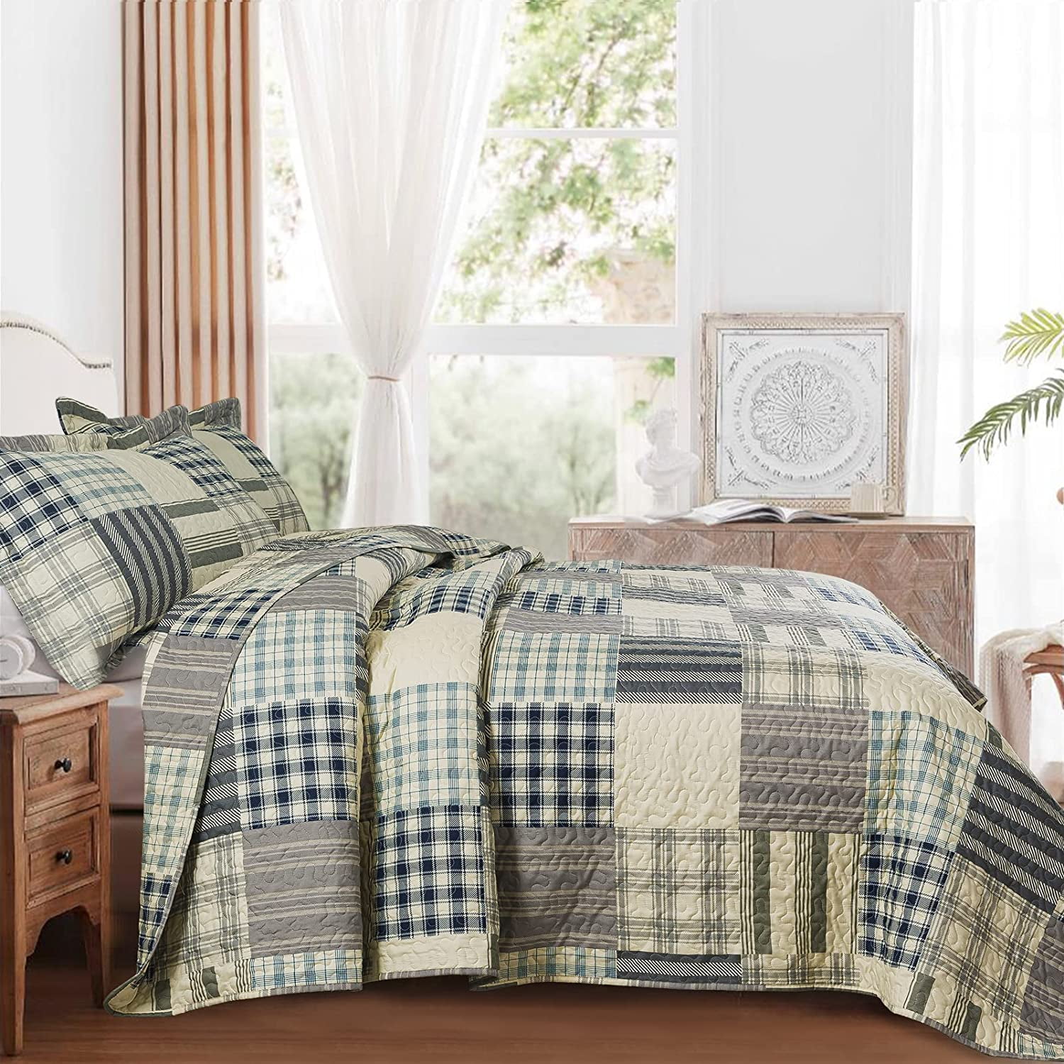 Queen Size Quilt Bedding Set 3 Pieces Quilt Queen Size Plaid Queen Quilt Bedding Set All Season Lightweight Reversible Coverlet Queen Bedspread For Farmhouse Bedroom Beige Gray Walmart Com